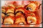 Bring to boiling. Lower the heat; simmer, partially covered, 30 minutes. Reserve. Combine the crumbs and flour in a large shallow pan. Beat the eggs and milk in a large bowl. Peel the eggplant; cut lengthwise into 1/8-inch thick slices. Dip into the egg mixture; dredge with the flour mixture, shaking off the excess. Set on wax paper. Working in batches and using about 3 tablespoons of oil per batch, sauté the eggplant in the large skillet until golden, 1 minute per side. Drain on paper toweling. Preheat the oven to 450 degrees. Combine the ricotta, mozzarella, parmesan and parsley in a bowl; mix well. Spread 2 to 3 tablespoons on one side of each slice of the eggplant. Roll up jelly roll fashion. Spread 1 cup of the tomato sauce over the bottom of the 13x9 inch baking dish. Arrange the rolls, seam-side down in a single layer in the dish. Spoon the sauce over the rolls. Bake, covered, in the preheated oven for 30 minutes or until the sauce is bubbly. Garnish with additional chopped parsley, if you wish. |